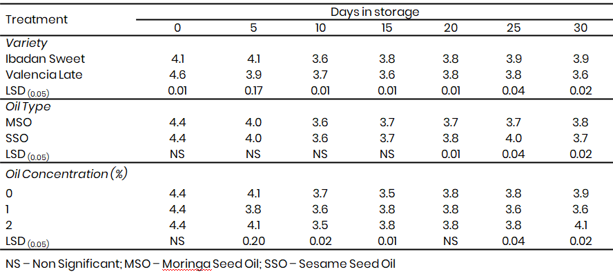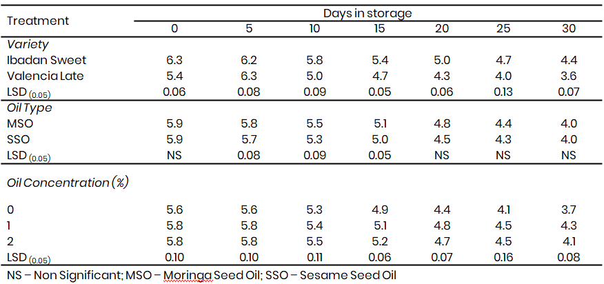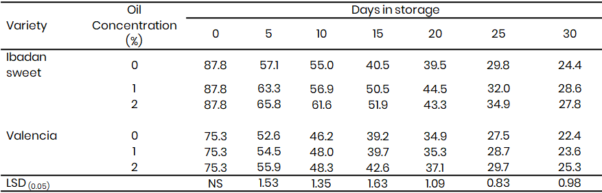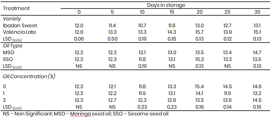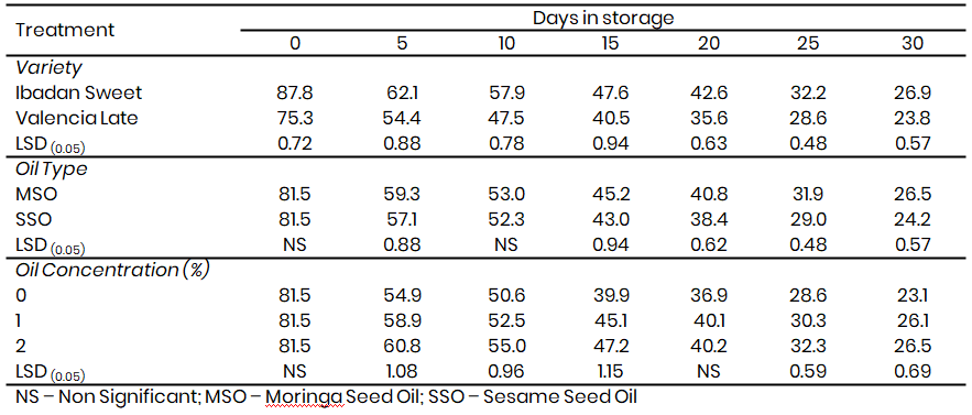 The experiment was a 2×2×3 factorial made up of variety (Ibadan Sweet and Valencia), edible oil type (Moringa seed oil, MSO, and Sesame seed oil, SSO) and oil concentration (0%, 1% and 2%). Factorial combinations were arranged in completely randomized design (CRD) with 3 replicates. The 0% acted as the control and was made up of distilled water only. Each experimental unit had 36 fruits giving a total of 1296 fruits. Biochemical changes, namely, total soluble solids, ascorbic acid, reducing sugar, pH and titratable acidity were monitored at 5-day intervals up to 30 days of fruit storage.
