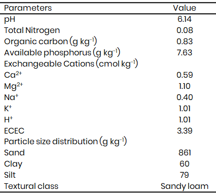 The result of physical and chemical properties of the pre cropping soil is presented in Table 1. It showed that the soil was slightly acidic with a pH of 6.14. Total nitrogen was very low (0.083%), compared to the standard value of (1-1.5), available phosphorus (7.63 mg kg-1) compared to the standard value of (7 - 7.20) and organic carbon (0.83%) compared to the standard value of (1.0 - 1.4) were low. Exchangeable base: potassium, calcium, magnesium and sodium of the soil range from 0.29–1.10 and 0.40 cmol kg-1, the texture of the soil was sandy loamy soil with sand, silt and clay content of 861, 79 and 60 g kg-1 respectively.