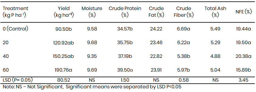 Significant difference was observed among the treatments for nitrogen free extract in which soybean treated with 40 P was significantly higher than those treated with 60 P but was comparable to those of 0 phosphorus and 20 phosphorus statistically. This is also an indication that application of phosphorus for soybean supports the availability of free nitrogen extract. This is consistent with the findings of Malik et al. (2006) who also discovered that nitrogen is one of the main yield related characters in soybean which of course is made more available with application of phosphorus.