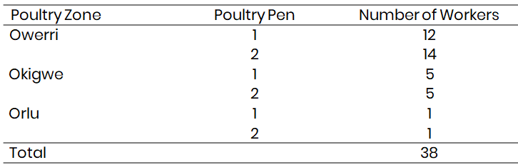 Thirty-eight respondents which represented the total population of workers in the six sampled poultry pens were administered questionnaires and their responses documented.