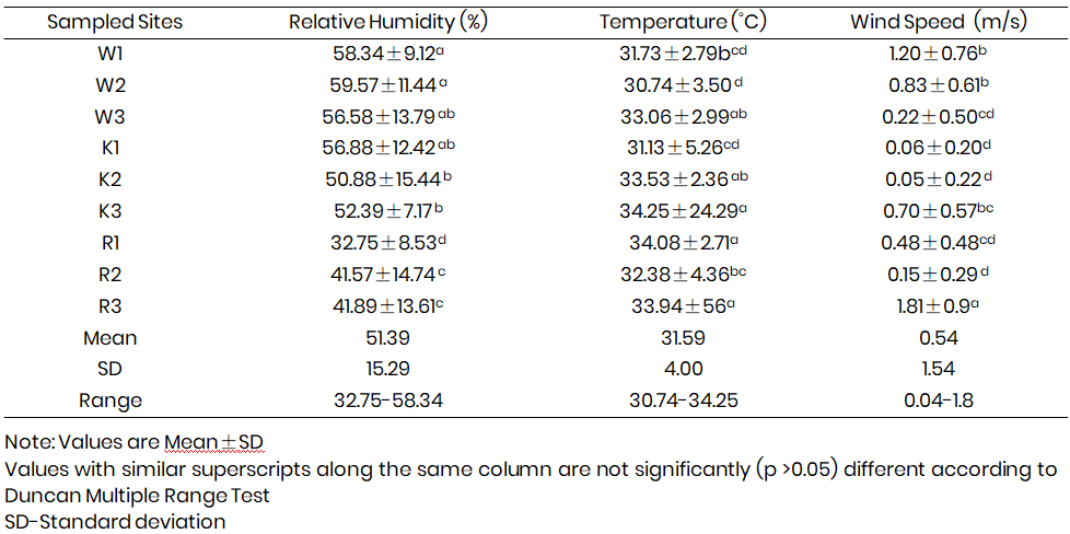 Temperature (Mean±SD) values ranged between 30.74±3.50and 34.08±2.71 ˚C. The highest temperature was recorded at K3 and the lowest at W2. R1 and R2 had significantly higher temperatures than pens.