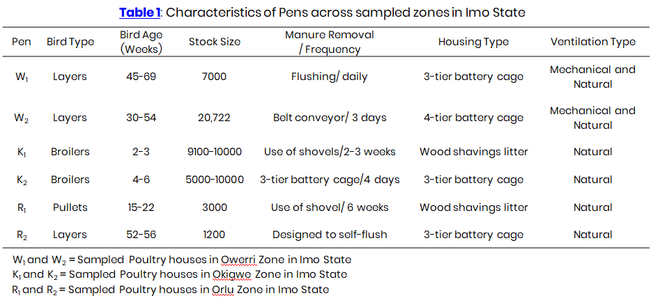 The Six poultry houses in three zones; Orlu, Okigwe, and Owerri, each marked by the letters R, K, and W as illustrated in Plates 1 - 6 were purposefully chosen from three poultry zones categorized by the Imo State-based Poultry Association of Nigeria (PANIS). Every month from December, 2021 to May, 2022, two poultry houses in each zone were sampled. These poultry houses passed both indoor and outdoor air sampling using the air sampler. In order to achieve a complete coverage of the surroundings for optimal coverage, both inside and outdoor air sampling spots were determined based on the air pollution levels in the poultry houses and population density of the poultry birds. Table 1 displays the parameters of the pens (W1, W2, K1, K2, R1 and R2) at the time of sampling. The sampled areas outside the pens are designated as W3, K3, and R3.