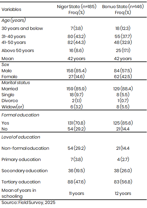 Marital status of the respondents: Table 1 showed that the majority (88.4%) of the respondents in Benue State and (85.9%) of the respondents in Niger State were married. This implies that farmers in the study area had the motivation to cater for their family needs such as provision of nutrition while also using family members as source of cheap labour for rice production activities. The result is in line with Okpe et al. (2019) who pointed out that, married persons were more involved in crop production due to higher food demand in the household.