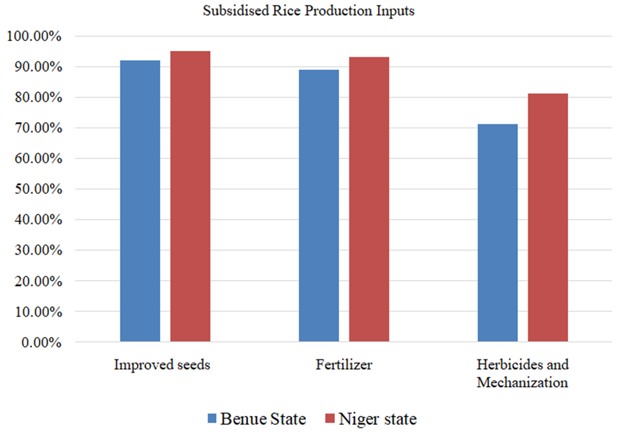 Furthermore, subsidies seed (95.0 %), subsidies fertilizer (93.0 %) and subsidies herbicides and mechanization (81.1 %) were the major input subsidies benefited among the respondents in Niger State. Similarly, to Benue State, the high uptake in Niger state reflects the programme’s strong focus on providing essential production inputs that directly enhance yield potential. Access to improved seed varieties likely improved germination rates, crop uniformity, and resistance to pests and diseases, enabling farmers to achieve higher and more stable yields. In addition, subsidized fertilizer provision allowed farmers to meet the nutrient requirements of their rice crop at reduced cost, promoting vigorous growth, better tillering, and improved grain filling. Subsidized herbicides and mechanization reduced the labour and time demands of manual weeding, ensured timely weed control, and minimized yield losses caused by weed competition. Similar to the findings of Ibitoye et al. (2017) who showed that access to fertilizer subsidies reduced the financial burden on farmers while ensuring that essential nutrients were applied in sufficient quantities, which has been shown to boost tiller production and grain filling.