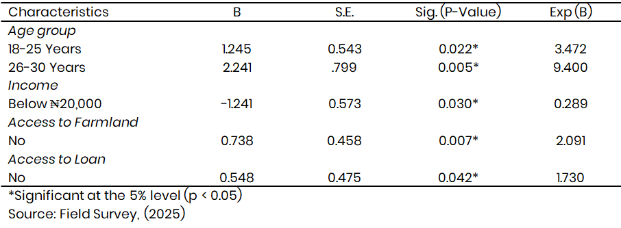 The logistic regression analysis further strengthens the evidence by identifying age, income, land access, and access to loans as significant predictors of youth participation in economic ventures. Specifically, respondents aged 18 - 30 were significantly more likely to participate than those above 40, highlighting the potential of young adults as a key target group for agribusiness interventions. The influence of income level was particularly striking: those earning below ₦20,000 monthly were significantly less likely to participate, a finding consistent with Oyekale (2019), who found that financial stability strongly predicts youth engagement in productive enterprises.