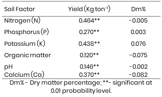 Relationships among the various elements that determine soil fertility and the yield and certain quality characteristics of tomato are given in Table 2. From the table, it could observe that tomato yield has a highly significant correlation with most of the factors that determine soil fertility which include nitrogen percent, phosphorus percent, potassium percent, organic matter content, calcium percent and pH. The positive correlation between the soil factors and characteristics and some quality characters of tomato indicates that for the crop to effectively produce a high yield, the soil factors that significantly influence yield must be taken into consideration during the production process.