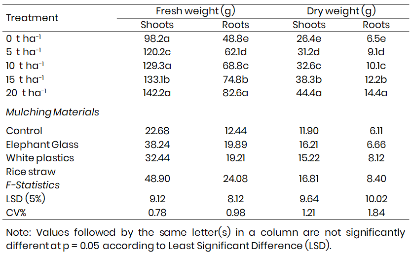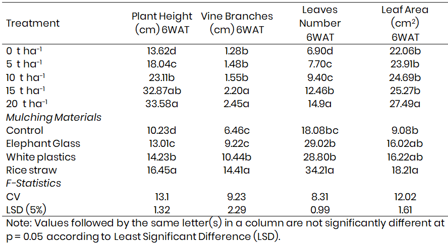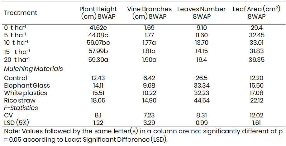From Table 3 below, the result below shows statistically significant (P<0.05) variation due to the effects of treatments on the plant height, vine length, leaf number, and leaf area at 4 weeks after transplanting. The maximum plant height (16.76 cm), higher vine length (1.11), leaf number (10.6) and broader leaf area (16.83) while the least value was obtained from 0t/ha control. This agreed with the work of Direkvandi et al. (2008) and Ayeni (2014) who reported a significant increase in plant height and number of branches as a result of the application of poultry manure. The result further shows that the use of mulches offers great hope because of their moisture-conserving ability and also, their moderate soil temperature (Ogundare et al., 2015). The present investigation also agreed with the findings of Ilodibia and Chukwuma (2015) who reported a significant increase in plant height, number of branches, and number of leaves as a result of the application of poultry manure. Higher soil temperatures increase nutrient availability, enhance nutrient uptake by roots, increase the number and activity of soil microorganisms, and speed up plant germination and growth (Farias-Larios et al., 1998). Similar results were obtained by Kayum et al. (2008), that mulching had significant effects on plant growth components. However, result shows a significant (P<0.05) differences on the use of different mulch materials on the growth of tomato at different growth stage. At 4WAT, tomato plant mulch with rice straw materials recorded higher plant height (8.67), highest vine branches (8.57), higher leaves per plant (10.47) and broader leafs (9.37) followed all planted mulch with white plastic which recorded the second taller plant, leaves number, higher vine branches and broader leaf compared to control treatment with no mulch which recorded the least at 4WAT. It has been shown that straw mulching can improve the net photosynthetic rate (Pn) of functional leaves of winter wheat (Zhai et al., 2021).
