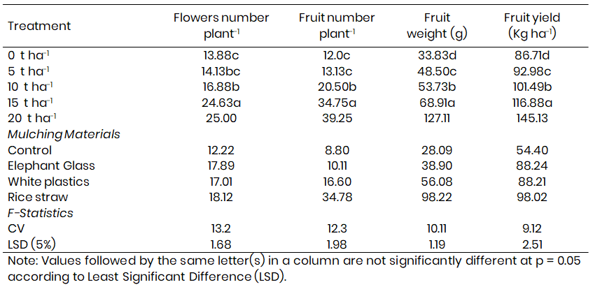 Statistically significant (P<0.05) variation was found due to the effects of treatments on the Number of flowers, Fruit number plant-1, Fruit Weight plant-1 (g), and Yield (kg ha-1) (Table 6). The highest number of flowers (25.00), was found in tomatoes planted using 20 t ha-1 while the minimum flower produced per plant, fruit number, fruit weight and yield was obtained from those plant treated with 0 t ha-1 (control). The average maximum number of fruits (39.25) was obtained from plant treated with 20 t ha-1 while the average minimum fruit number was given in control. However, the tomatoes planted using 20 t ha-1 recorded heavier (127.11 g), and maximum marketable yield (235.13 t ha-1) with the minimum fruit weight recorded from control plot. This is in line with the findings of Ghorbani et al. (2008) who reported that tomato fruit weight. This may be attributed to the sufficient release of nutrients particularly N, P, and K contained in the poultry manure applied, as these nutrients improve the yield of tomato. This agreed with the finding of Agbede et al. (2019) who reported that fruit and fruit quality is improved as a result of the application of poultry manure. Al-Amin et al. (2017) reported that yield and yield-related traits are affected by mulching and the application of organic manure. All treatment with mulching produced significantly higher fruit yield and number of fruits per plant than organic mulches and no mulch this might be the result of weed free field, less nutrient loss through leaching favourable soil temperature and moisture, these findings are in agreement with and Kashyap et al. (2009). Nikolic et al. (2012) have also reported similar results that highest number of fruits per plant was recorded in the plants grown on the plastic mulch than those on organic mulches and control (no mulch). Similar findings were also obtained mulched and non-mulched plots by Hudu et al. (2002), Aruna et al. (2007), Nagalakshmi et al. (2002). Interestingly, among the different mulch materials applied in the study, rice straw mulching outperformed in terms of flower number (18.12), fruit produced per plant (16.60) fruit weight (56.08 g) and fruit yield (88.21 kg ha-1) respectively.