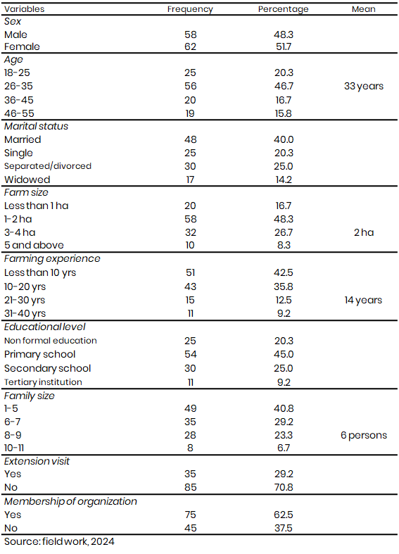 Findings of the study indicated that majorities (51.7%) of the farmers were female while 48.3% of them were male (Table 1). This finding contrasts with the general expectation that cassava farming is typically male-dominated, as reported by Tesfamicheal et al. (2017). The higher female participation observed in this study may be attributed to the role of cassava in household food security and its compatibility with domestic traditionally undertaken by women. Moreover, 40% of the cassava farmers were married and 20.3% were single. This implies that the respondents were dominated by married men and women who invariably contributed to increase in household size farm labour (Tesfamicheal et al., 2017). However, 45% of them completed primary school education while 25% of the farmers completed secondary school education respectively. This implies on the aggregate that the majority of the farmers had one form of education or the other, and thus had the advantage of adopting innovation, since education helps in adopting improved agricultural technologies as observed by Tesfamicheal et al. (2017).