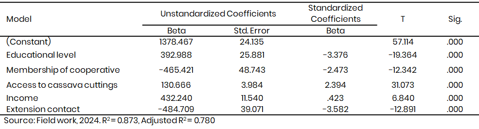The decision to adopt agronomic practices by the farmers was significantly influenced by some socioeconomic factors (Table 4). Among these were: educational level, membership of cooperative, access to cassava cuttings, income and extension contact. These variables were found to be statistically related to the factors influencing the levels of adoption of improved cassava agronomic practices by the farmers in study area. Educational level, income, extension contact, and cooperative membership are significant determinants of improved agronomic practices in cassava production, with higher education, increased income, frequent extension contact, and active participation in cooperatives generally leading to greater adoption of best practices (Nwaobiala, 2018). These factors provide farmers with the knowledge, resources, and social support needed to adopt new technologies and improve their production systems. The finding agrees with Afolami et al. (2015) that availability of improved cassava cutting within the village determines the adoption of improved cassava agronomic practices by the farmers in study area. Also, the study is in agreement with Fidelis et al. (2023) that access to extension services and cooperative membership significantly influenced adoption of cassava farmers' agronomic practices in the study area. According to Wossen et al. (2017), access to extension services can boost the adoption of new farm technology by removing barriers caused by information inefficiencies. Extension access, in particular, supports adoption by exposing farmers to new technology and teaching them about appropriate agricultural and management practices (Fidelis et al., 2023).