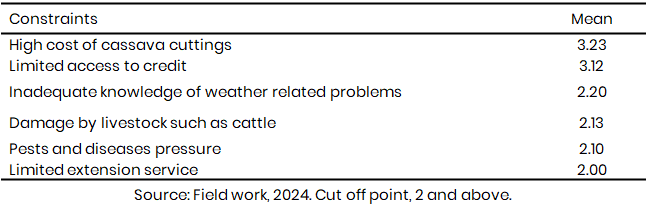 On the other hand, the constraints to adoption of good agronomic practices (GAP) among cassava farmers; high cost of cassava cuttings, limited access to credit, lack of knowledge of weather related problems, damage by livestock such as cattle, pests and diseases pressure and limited extension service respectively (Table 5). This result is in line with Fidelis et al. (2023) that high cost of improved cassava materials and inadequate information of the improved variety were the constraints working against agronomic practices in their study, also the finding is in line with where they said that inadequate funds were the major constraint facing adoption of cassava agronomic practices in their study.