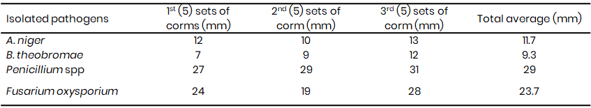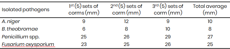 The growth rate varied from 3rd day to the 5th day while beyond the 6th day they attained their maximum growth rate covering the entire petri dishes. The mean radial diameter (Fig. 3-4) of the isolates differed significantly suggesting differences in the virulence of the isolates. While F. oxysporium and Penicillium spp. were more aggressive with an average diameter rot of 25 and 27 mm (Fig. 3 and 4) respectively, B. theobromae (Fig. 5) and Aspergillus niger (Fig. 6) recorded the least mean diameter of 8 mm and 10 mm respectively (Table 2A).