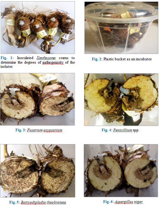 The ability of these isolates to induce rot on wholesome Xanthosomas agittifolium corms were investigated. Fig. 1 and 2 are typical representations of inoculation, incubation, and disease induction and progression in wholesome Xanthosoma corms after nine days of incubation.
