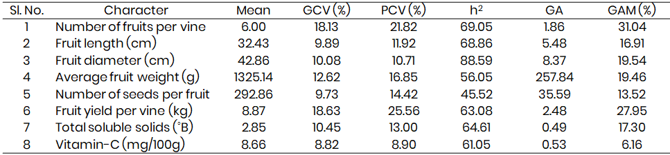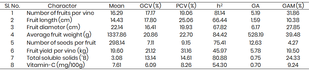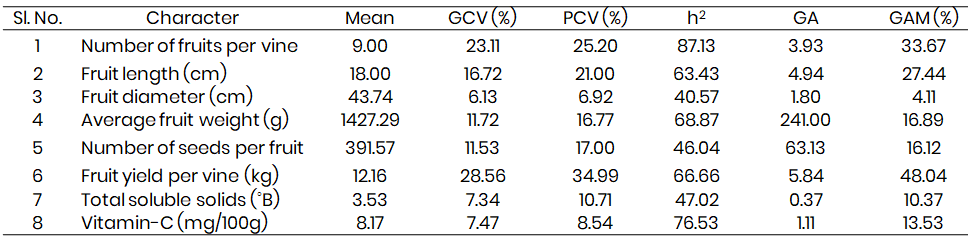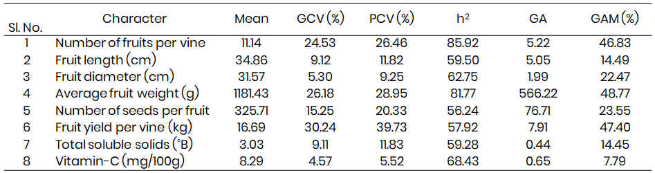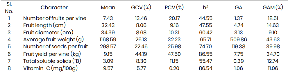 Moderate estimates of GCV and PCV were observed in the traits viz., fruit length, number of seeds per fruit in Pusa Sandesh × Arka Bahar, number of fruits per vine, fruit diameter in Pusa Sandesh × Punjab Bahar, number of fruits per vine in Pusa Naveen × Pusa Santhusti, number of fruits per vine, fruit length and average fruit weight in Pusa Naveen × Local Long, number of fruits per vine, fruit length, average fruit weight, number of seeds per fruit in Pusa Naveen × Local Round.