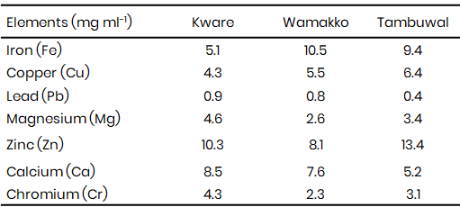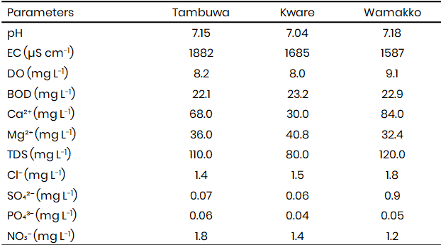The physicochemical parameters (Table 1) studied showed that the pH values of irrigation water samples from Tambuwal (7.15), Kware (7.04), and Wamakko (7.18) fall within the permissible range of 6.5–8.5 recommended by WHO and SON, indicating that the water is suitable for agricultural use in terms of acidity and alkalinity. Electrical conductivity (EC) values, however, were high (1882 µS cm-1 in Tambuwal, 1685 µS cm-1 in Kware, and 1587 µS cm-1 in Wamakko), exceeding the WHO and FAO recommended limits of ≤1000 µS cm-1 and 750 µS cm-1, respectively. Elevated EC reflects high salinity, which could pose a risk to soil structure and crop productivity, this is in agreement with reports by Oladipo et al. (2022) that high conductivity levels in irrigation water reduce soil permeability and affect crop yield.