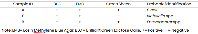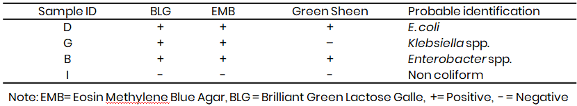Colonies from the positive presumptive tubes, a loopful was streaked onto Eosin Methylene Blue (EMB) agar plates and incubated at 35–37 °C for 24 hours. Colonies showing green metallic sheen (indicative of E. coli) or dark-centered colonies (other coliforms) were considered positive.