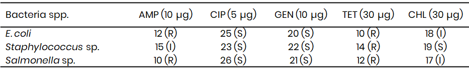 Staphylococcus spp. from Kware demonstrated intermediate resistance to ampicillin (15 mm), sensitivity to ciprofloxacin (23 mm), gentamicin (22 mm), and chloramphenicol (19 mm), but resistance to tetracycline (14 mm). A comparable observation was made by Olanrewaju et al. (2022), who found that Staphylococcus spp. isolated from sachet water were consistently resistant to tetracycline but susceptible to ciprofloxacin and gentamicin, reinforcing the persistence of these resistance trends in local water supplies. Similarly, Salmonella spp. in Kware was resistant to ampicillin and tetracycline yet sensitive to ciprofloxacin (26 mm) and gentamicin (21 mm), reflecting findings by Adeyemi et al. (2022), who documented resistance to first-line antibiotics in Salmonella isolates from food and water in southwestern Nigeria.