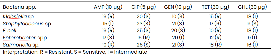 This multidrug resistance reflects the trends seen in Wamakko and corresponds with global concerns highlighted by WHO (2022), which noted that Enterobacter spp. is increasingly recognised as an emerging multidrug-resistant pathogen in low-resource settings. Salmonella spp. from Tambuwal was also resistant to ampicillin and tetracycline, but sensitive to ciprofloxacin (26 mm) and gentamicin (21 mm), echoing reports by Adeyemi et al. (2022) that ciprofloxacin remains effective against Salmonella spp. despite the widespread resistance to other drugs.